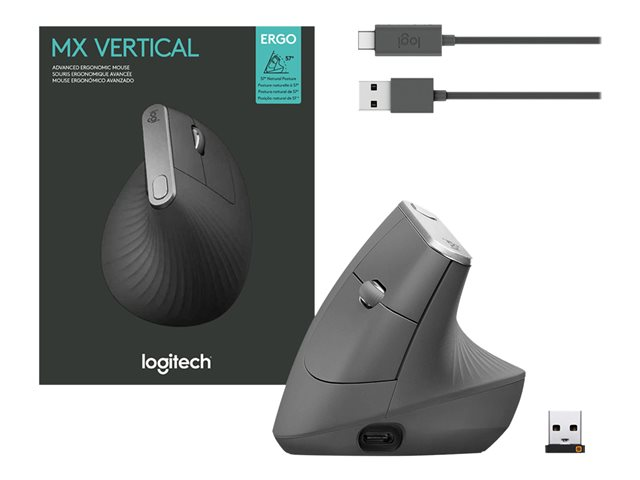Logitech MX Vertical - Pystyhiiri - ergonominen - optinen - 6 painiketta - langaton, langallinen - Bluetooth, 2.4 GHz - USB johdoton vastaanotin - grafiitti