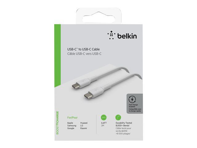 Belkin BoostCharge - USB-kaapeli - 24 pin USB-C (uros) to 24 pin USB-C (uros) - 2 m - valkoinen CAB003BT2MWH