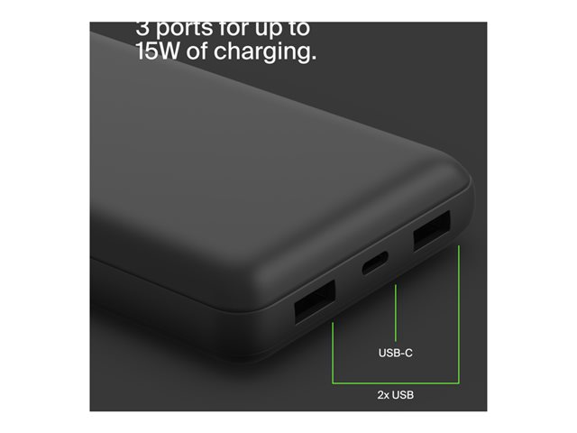 Belkin BoostCharge - Virtapankki - 20000 mAh - 15 watti(a) - 3 A - 3 lähtöliittimet (24 pin USB-C, 2 x USB) - johdossa: USB-C - musta