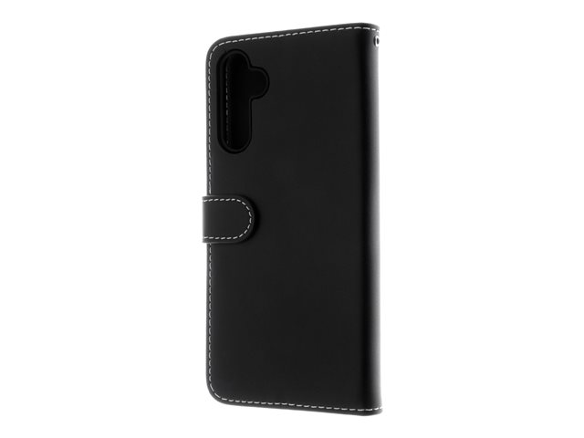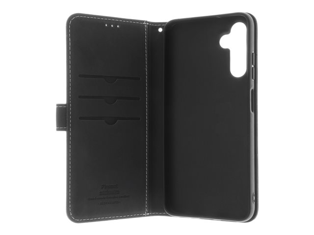 Insmat Exclusive - Läppäkansi matkapuhelimelle - nahka, kartonki + paperi + alumiinifolio, termoplastinen polyuretaanikehikko (TPU), puuvillaompeleet - musta malleihin Samsung Galaxy A25