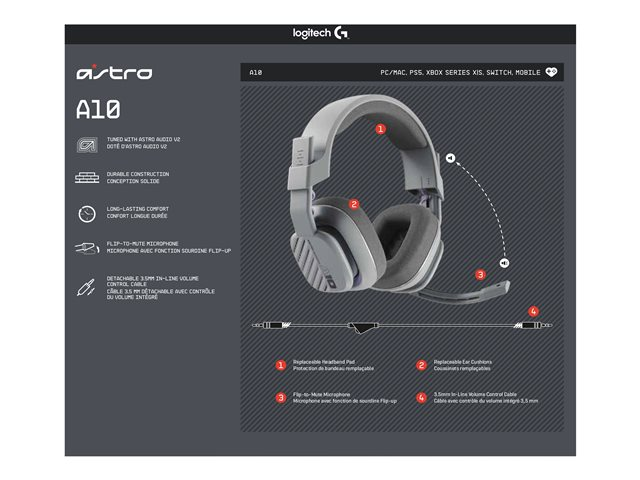 ASTRO Gaming A10 Gen 2 - Kuulokkeet + mikrofoni - täysikokoinen - langallinen - 3,5 mm jakkiliitin - harmaa